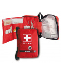 červená taška na zip 85g určená na sestavení vlastní lékárny se 12 volně přístupnými přihrádkami, 8 pružnými poutky, síťovanou kapsou na zip a možností upevnění k opasku či popruhu batohu