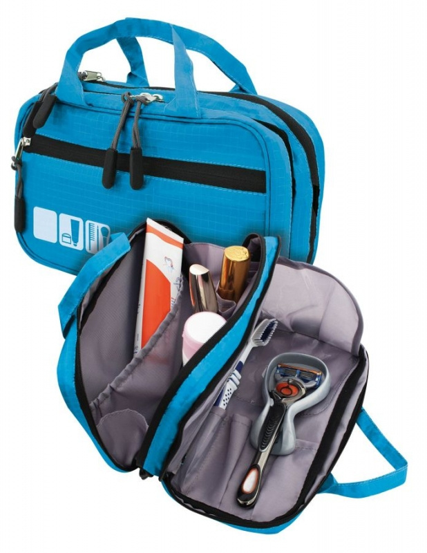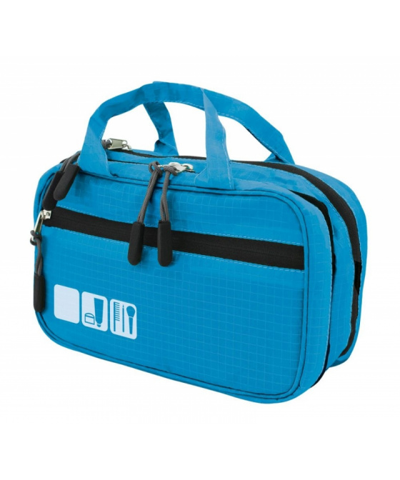 lehká větší modrá toaletní taška 106g na delší cesty z polyesteru ripstop pro uložení kosmetických doplňků se dvěma odděleními na zip, několika vnitřními přihrádkami a kapsami a vnější kapsou na zipVíce