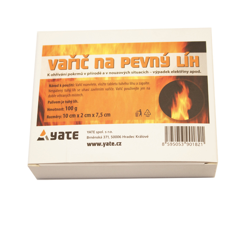 Malý, lehký a skladný vařič na tuhý líh Yate z ocelového plechu o hmotnosti 100 g. Vhodný pro tramping, turistiku a nouzové vaření. Léty prověřená kvalita. Složí se do malé krabičky.
