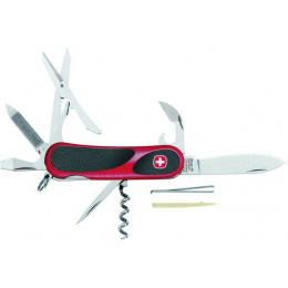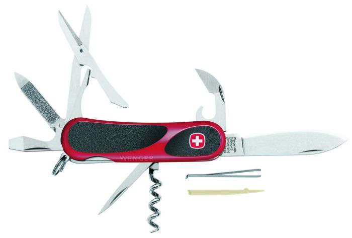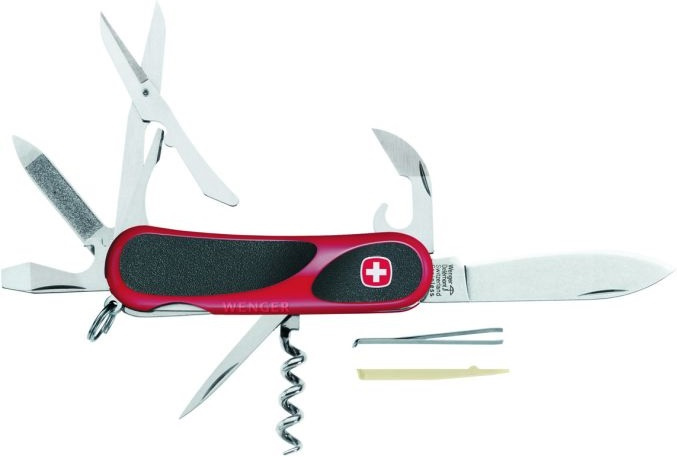 řada nožů s protiskluzovým povrchem aergonomickým tvarem, umožňujícímlepší úchop nůžky multifunkční nástroj (plochýšroubovák, otvírák nalahve, ohýbač drátů a stahovač izolace) otvírák na konzervy pilník na nehty vývrtka bodec pinzeta párátko kroužek pro zavěšeníVíce