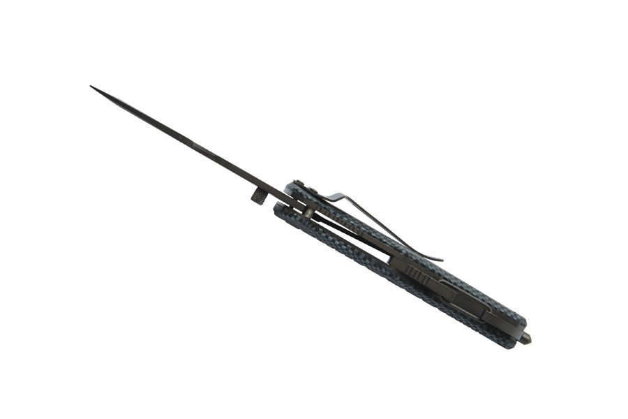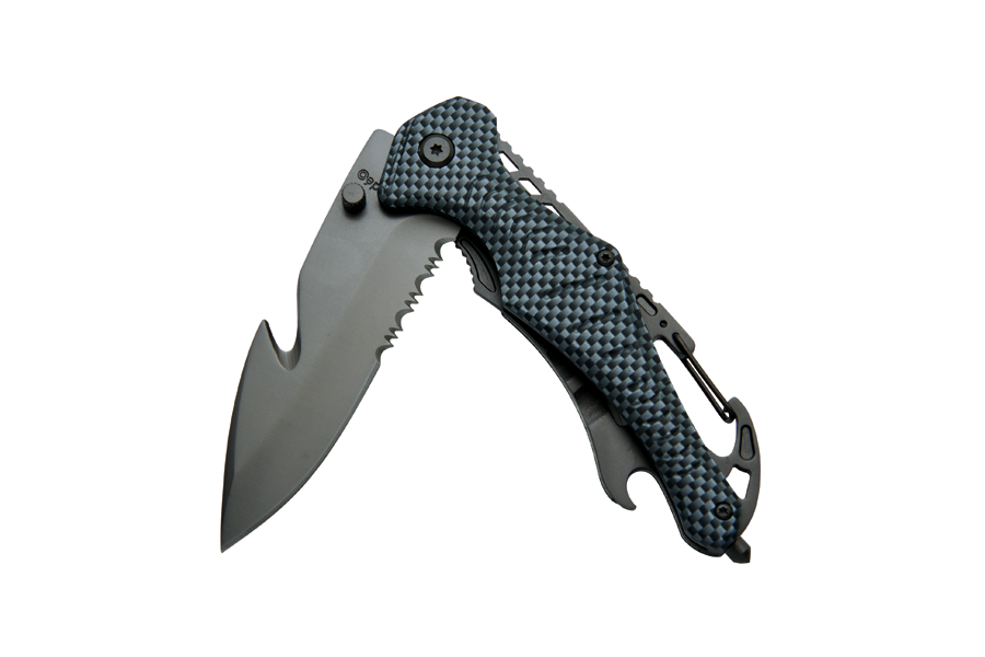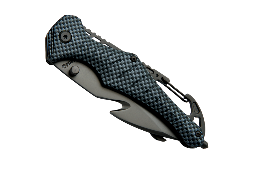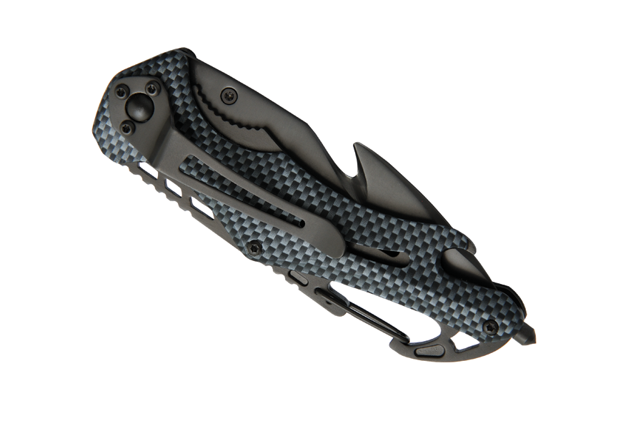 Záchranářský nůž v technickém provedení s rukojetí v imitaci karbonu.