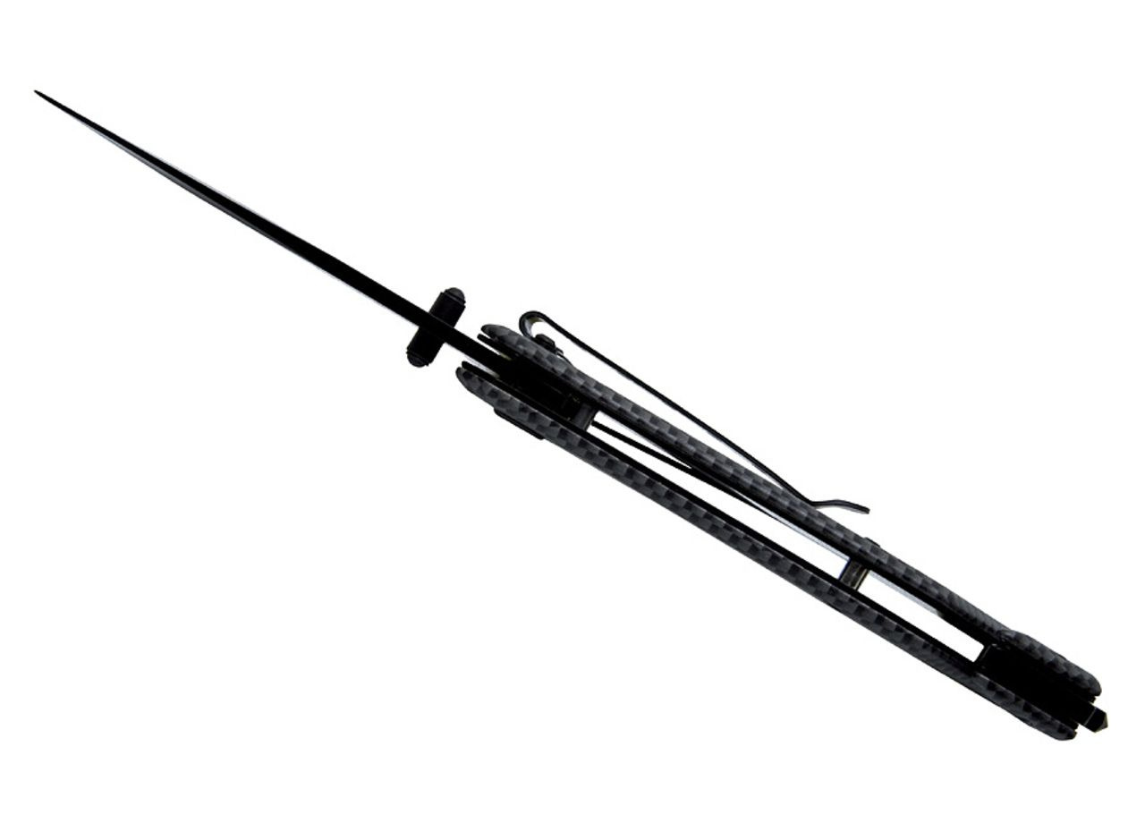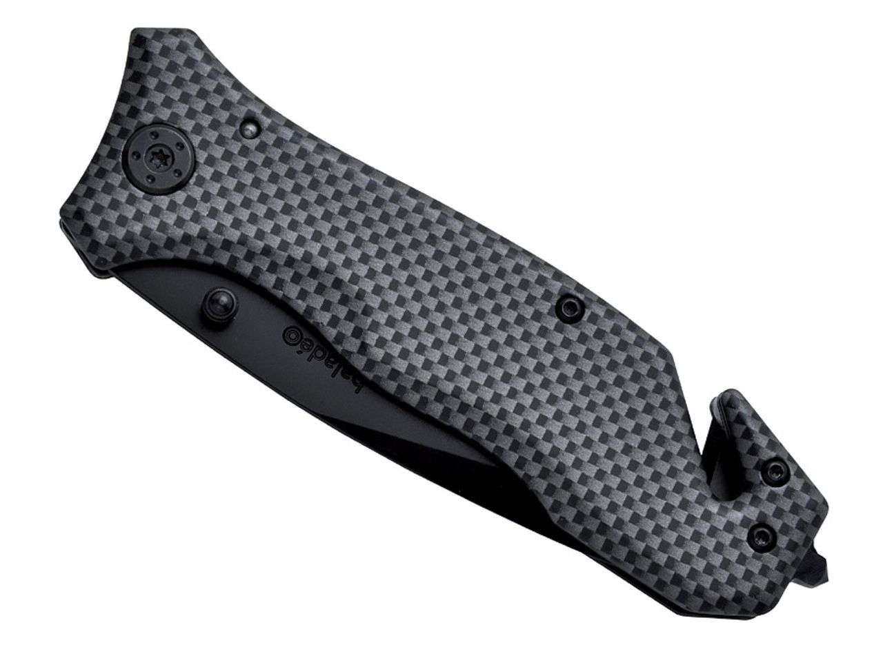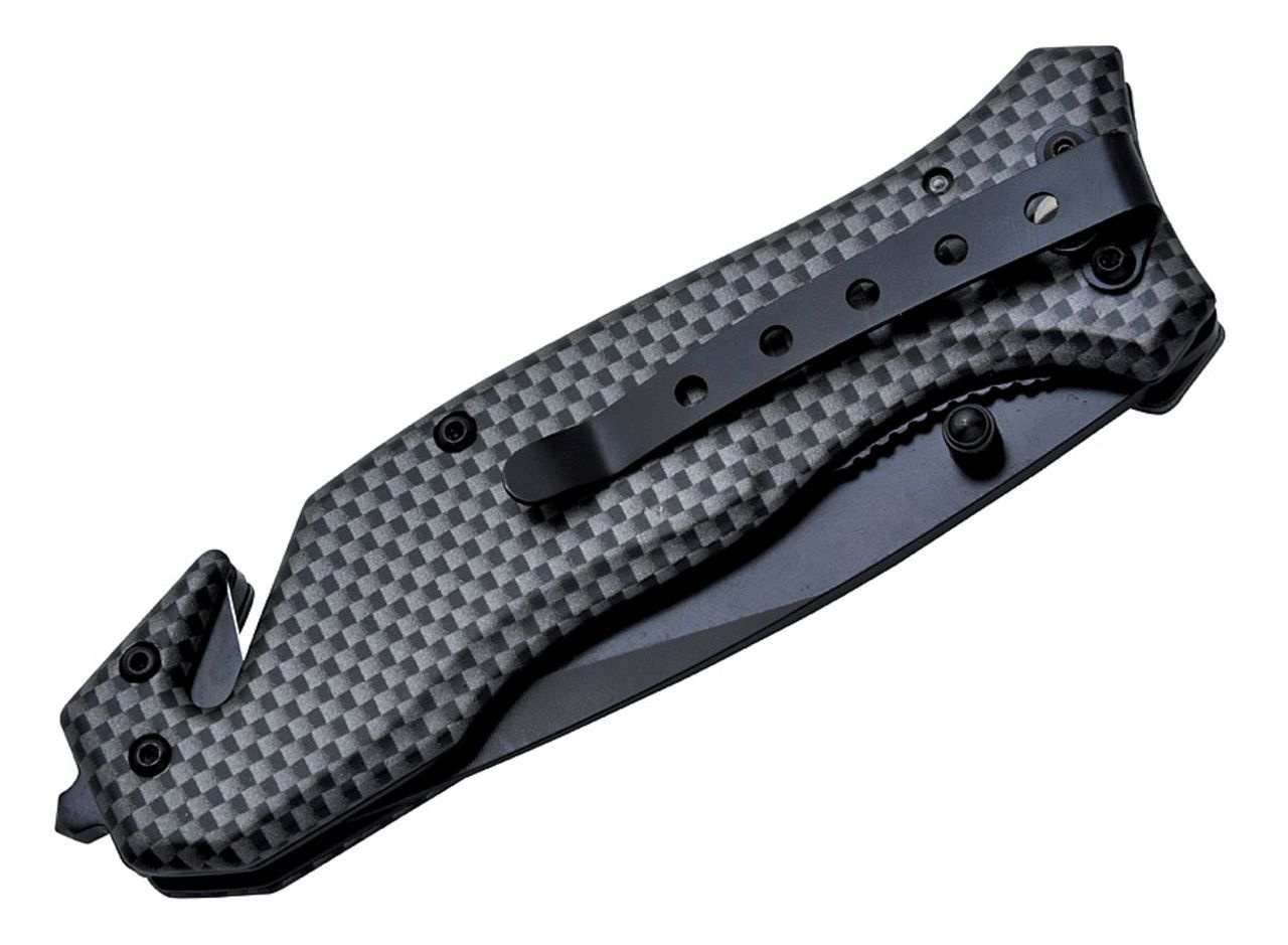 Folding knife. Half serrated 420 stainless steel blade with titanium coating. One hand opening and closing for left handed and right handed people. Semi automatic opening. Liner lock system. Stainless steel and aluminium handle with carbon fiber imitation. Belt cutter and window breaker at the rear of the handle. Belt clip.