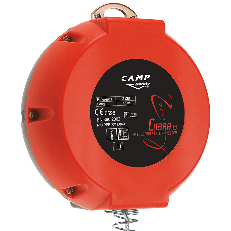 Cobra 15 je samo navíjecí zachycovač pádu s délkou ocelového lana 15m. Systém Cobra 15 je certifikován pro práci na rovné i nakloněné ploše. Galvanizované ocelové lanko s průměrem 4,8mm a maximální pevností 12kN je chráněno velice odolným pouzdrem z velmi odolného ABS platu. Samo navíjecí zachycovač pádu CAMP Cobra 15 nabízí maximální bezpečnost i při zatížení přes ostrou hranu. Součástí systému je ocelová dlaňová auto uzamykatelná karabina s obrtlíkem CAMP Swivel Hook a vnitřní mechanický systém pro tlumení pádu.