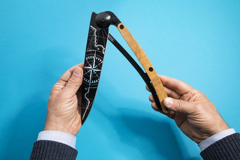 Největší nůž Deejo, jaký si jen lze představit, v provedené se stylovým tetováním Terra Incognita.Více